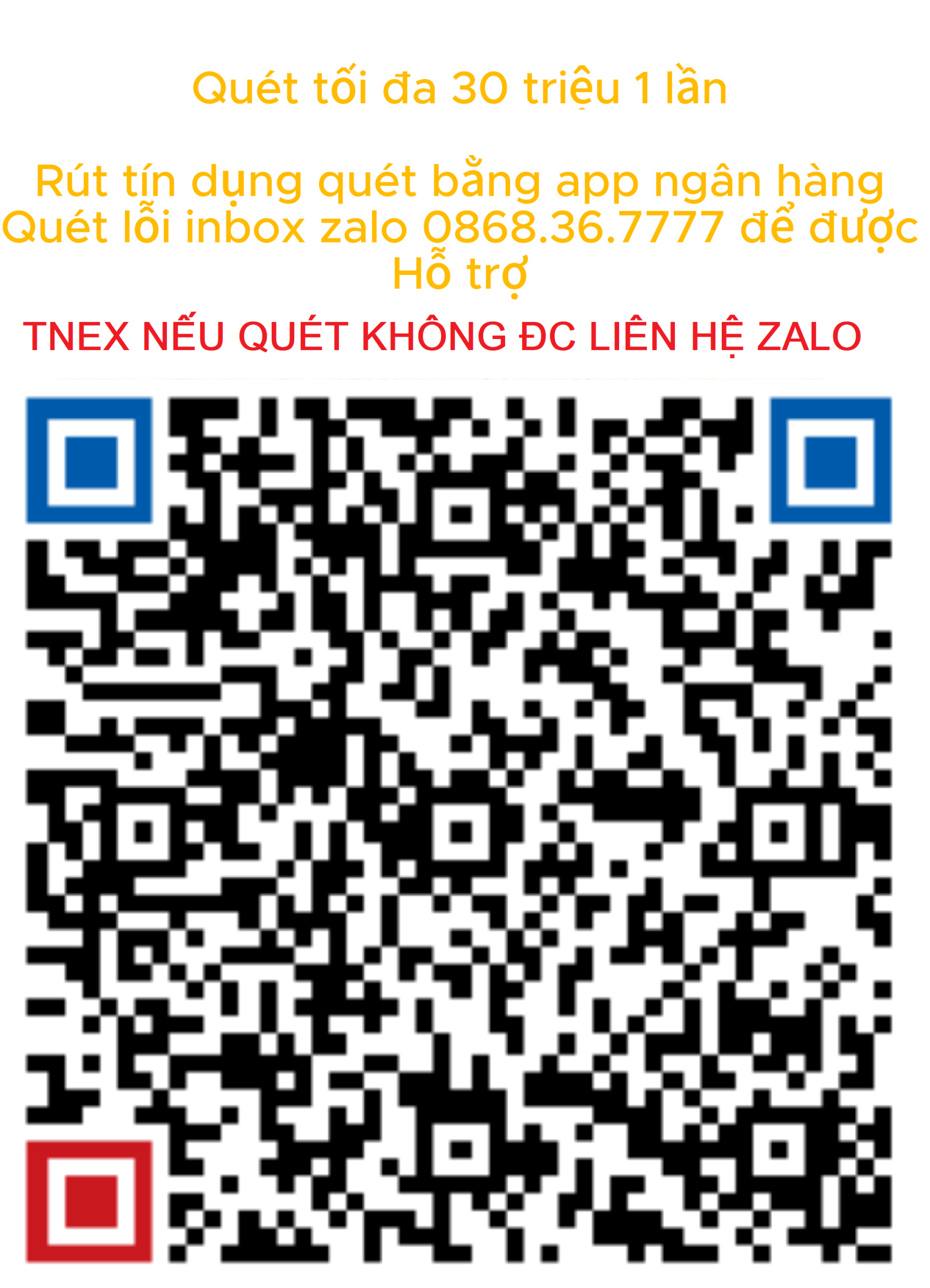 Chú ý: Quý khách quét trực tiếp bằng ứng dụng ngân hàng, chọn nguồn tiền từ thẻ tín dụng, trường hợp ngân hàng không được hỗ trợ inbox zalo 0868.36.7777 để được hỗ trợ